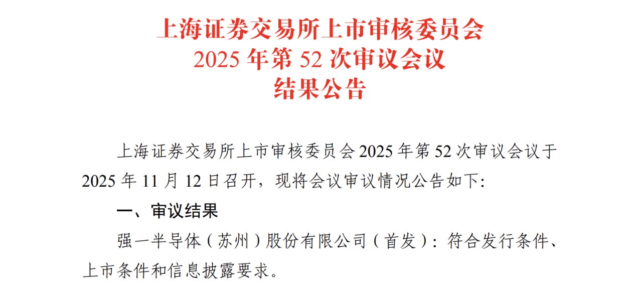 上证报中国证券网讯(钱佳滢 记者 仲茜)11月12日,上海证券交易所上市审核委员会召开2025年第52次审议会议。审议结果显示,强一半导体(苏州)股份有限公司(以下简称“强一股份”)符合发行条件、上市条件和信息披露要求,拟登陆科创板。