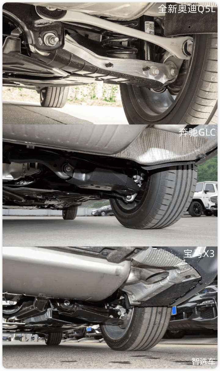 在底盘结构上,全新奥迪Q5L采用了前后五连杆悬架,奔驰GLC是前双叉臂+后五连杆悬架,宝马X3则是前双球节弹簧减振支柱(麦弗逊式的一种变体)+后五连杆悬架。单看结构三款车的后悬架类型一致,主要差异在于前悬架,Q5L最优,GLC次之,X3略逊一筹。