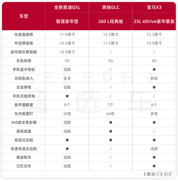 其余配置方面,三款车的入门版各有优劣,比如全新奥迪Q5L多出了手机无线充电和全速自适应巡航;奔驰GLC多出了透明底盘功能;宝马X3则多出了手机蓝牙钥匙、主动降噪、循迹倒车和记忆泊车功能。